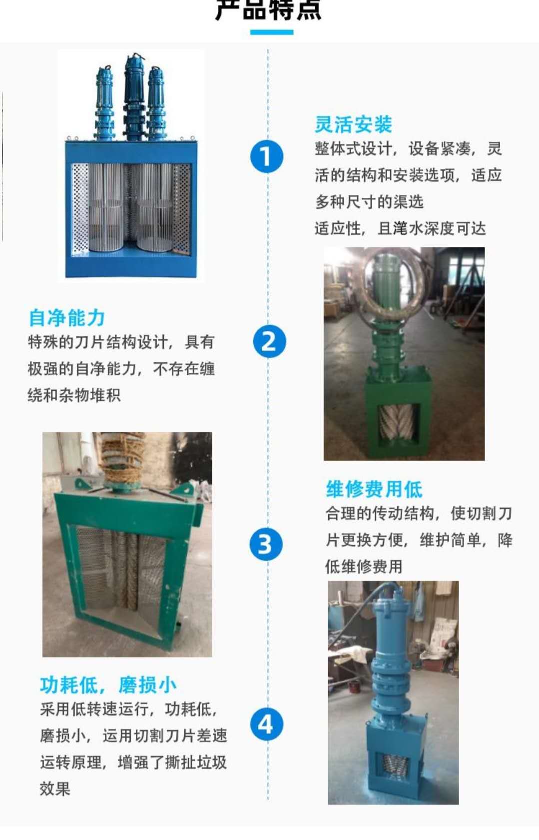 該設(shè)備應(yīng)用先進技術(shù)將污水,污物中的中大體積固體顆粒粉碎成6—10mm的細小顆粒,與污水一起進入后續(xù)處理工序,無需進行格柵渣滓的清運,為實行泵站地埋式的全封閉設(shè)計創(chuàng)造了有利條件,節(jié)約了土建造價,美化了環(huán)境,廣泛應(yīng)用于市政、水利泵站系統(tǒng);可代替?zhèn)鹘y(tǒng)格柵或與其配合使用。與傳統(tǒng)格柵的泵站相比,柵渣在水中進行粉碎處理,無需清理廢棄物;可避免臭氣外泄,保護環(huán)境,大量減少占地面積;安裝維護簡單,可實現(xiàn)水下自動耦合安裝。